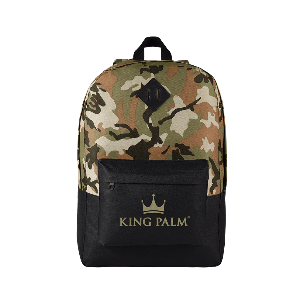 Lleve todas sus necesidades para fumar y represente a King Palm en el camino con nuestra elegante mochila de camuflaje. Este accesorio altamente funcional puede adaptarse a todas sus bandejas de liar, rollos e incluso una pieza de vidrio (embalada de manera segura). El diseño mitad camuflaje mitad negro puede atraer a los fanáticos de King Palm de todo tipo. Esta mochila es simplemente el complemento perfecto para tu colección.